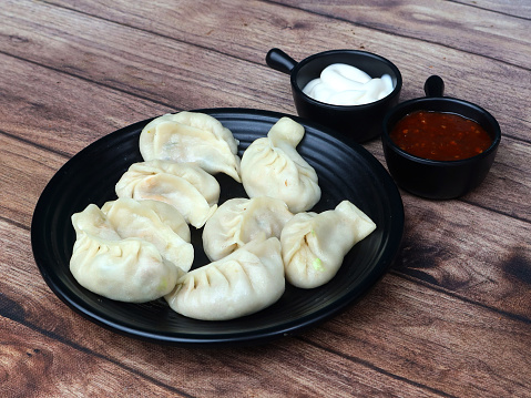 Momos stuffed with fresh chopped vegetables [onion, carrot, cabbage, coriander herbs and tinch of spices served with authentic red momos chilli chutney.